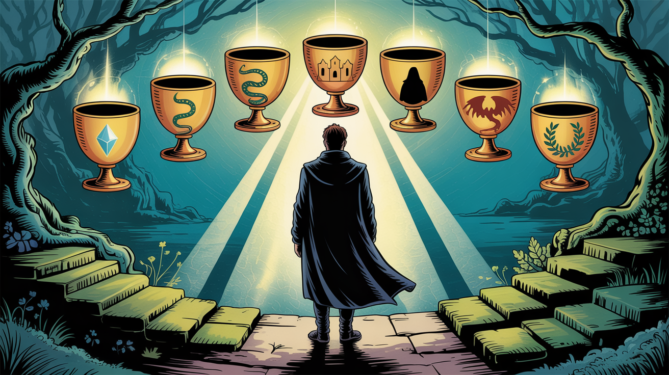 El 7 de Copas es la carta de la imaginación desbordada, las tentaciones y los sueños que parecen demasiado buenos para ser verdad. Representa esos momentos en los que tienes tantas opciones sobre la mesa —trabajo, amor, viajes, proyectos creativos— que terminas paralizado sin saber qué camino elegir.